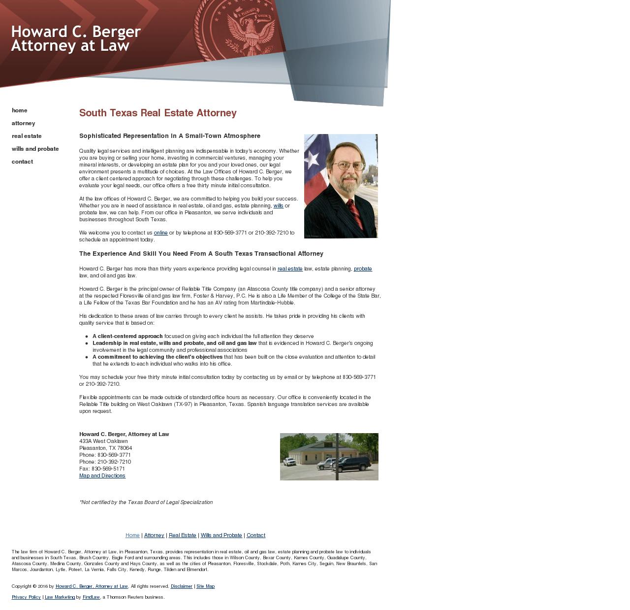 Howard C. Berger, Attorney at Law Pleasanton TX Real Estate | Floresville Estate Planning Attorney | Wilson County Texas Probate Get quality and experience in real estate, wills and probate law from Pleasanton real estate attorney, Howard C. Berger. Call 830-569-3771 or 210-392-7210.