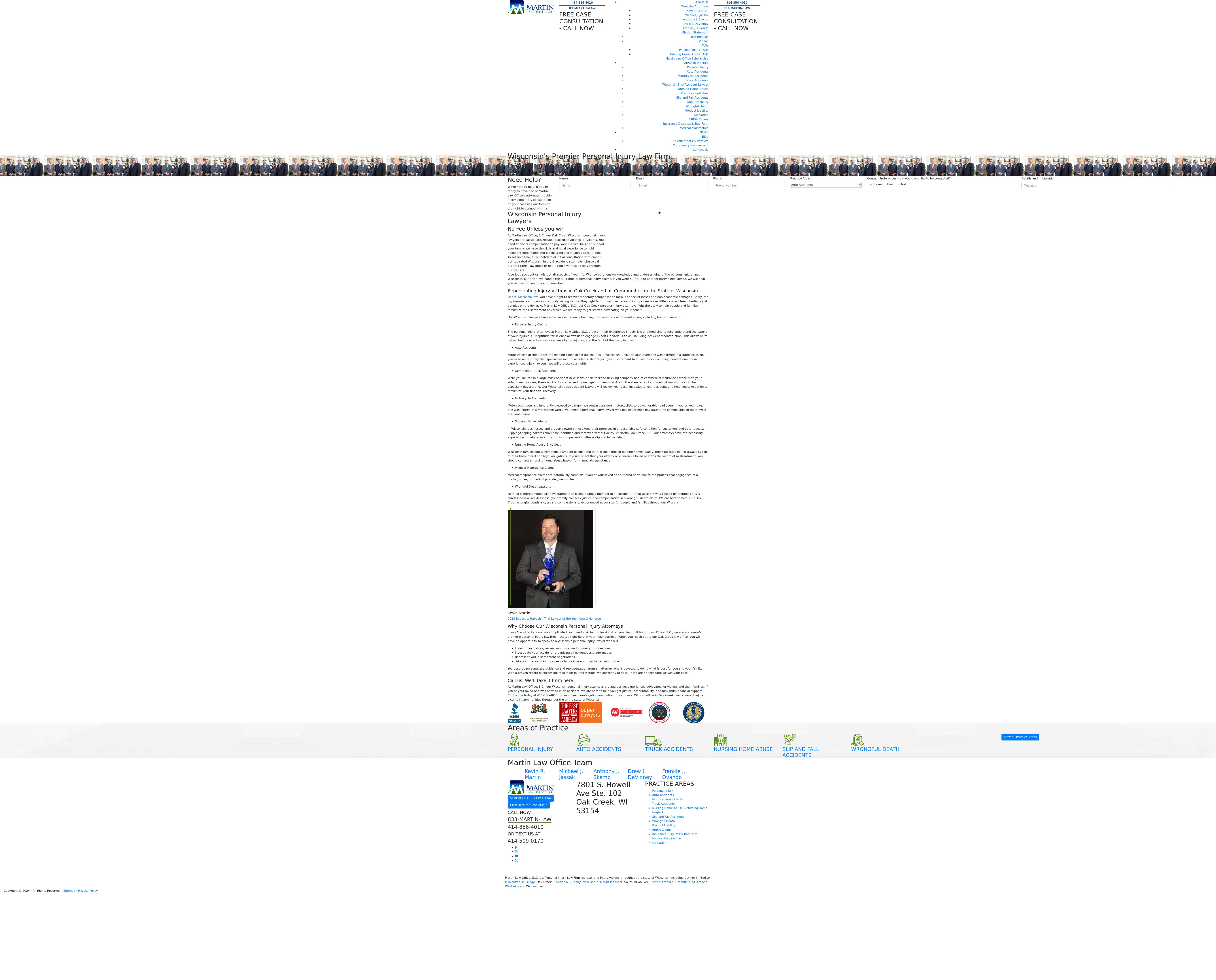 Martin Law Office, S.C. Oak Creek WI Personal Injury Lawyer | Milwaukee County Accident When you suffer serious injury, Milwaukee personal injury lawyer Kevin Martin can help. 414-856-4010.