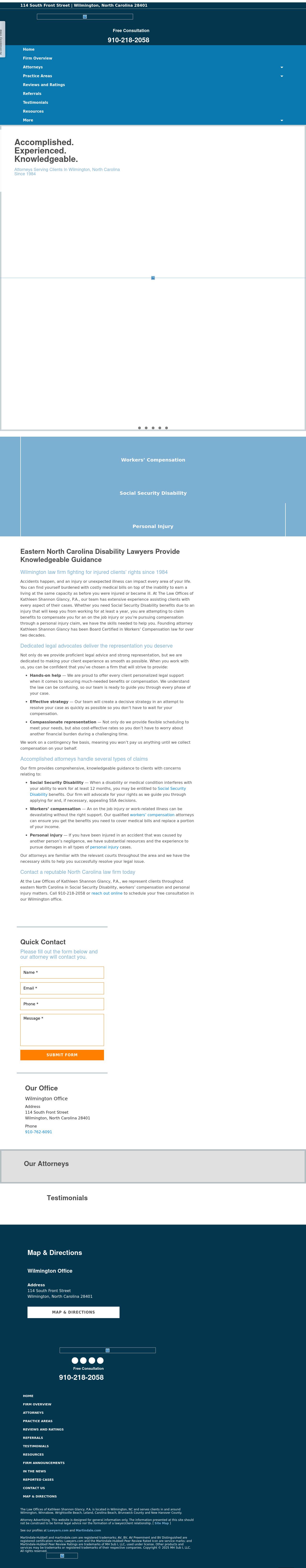 The Law Offices of Kathleen Shannon Glancy, P.A. Wilmington Workers Compensation & Social Security Disability Attorneys | Eastern North Carolina Disability Claim Lawyer | Williamston NC Injury Attorney Over a century of combined experience in SSD, workers' comp and personal injury. Let The Law Offices of Kathleen Shannon Glancy, P.A., help you.